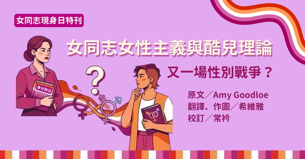 時至今日,本土反跨性別勢力便是濫用台灣人對這段理論演進史的無知,透過挪用女同志女性主義中的「反性緣」(強調女人與女人之間的「非性」連結)跟「女本位」(學術上精確的說法應該是「女性主體性」或「女性立足點」)論述、並妖魔化酷兒理論為「多元性癖男權運動」或「屌運」的方式,藉此散布「同/跨運吃正在女人」或「多元性別政治正確讓女人消失」等論述來引發女性主義社群內部的恐慌。在此要特別感謝作者古德洛教授,在得知台灣及華語世界的情況後,願意授權本文給我們進行翻譯工作,幫助台灣讀者釐清女同志女性主義真正的歷史跟主張,而非道聽塗說。